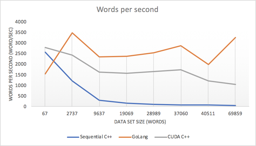 Compared to a basic sequential implementation in C++, this application runs 50x faster on a dataset of 70k words on an intel i5 3.3GHz CPU.