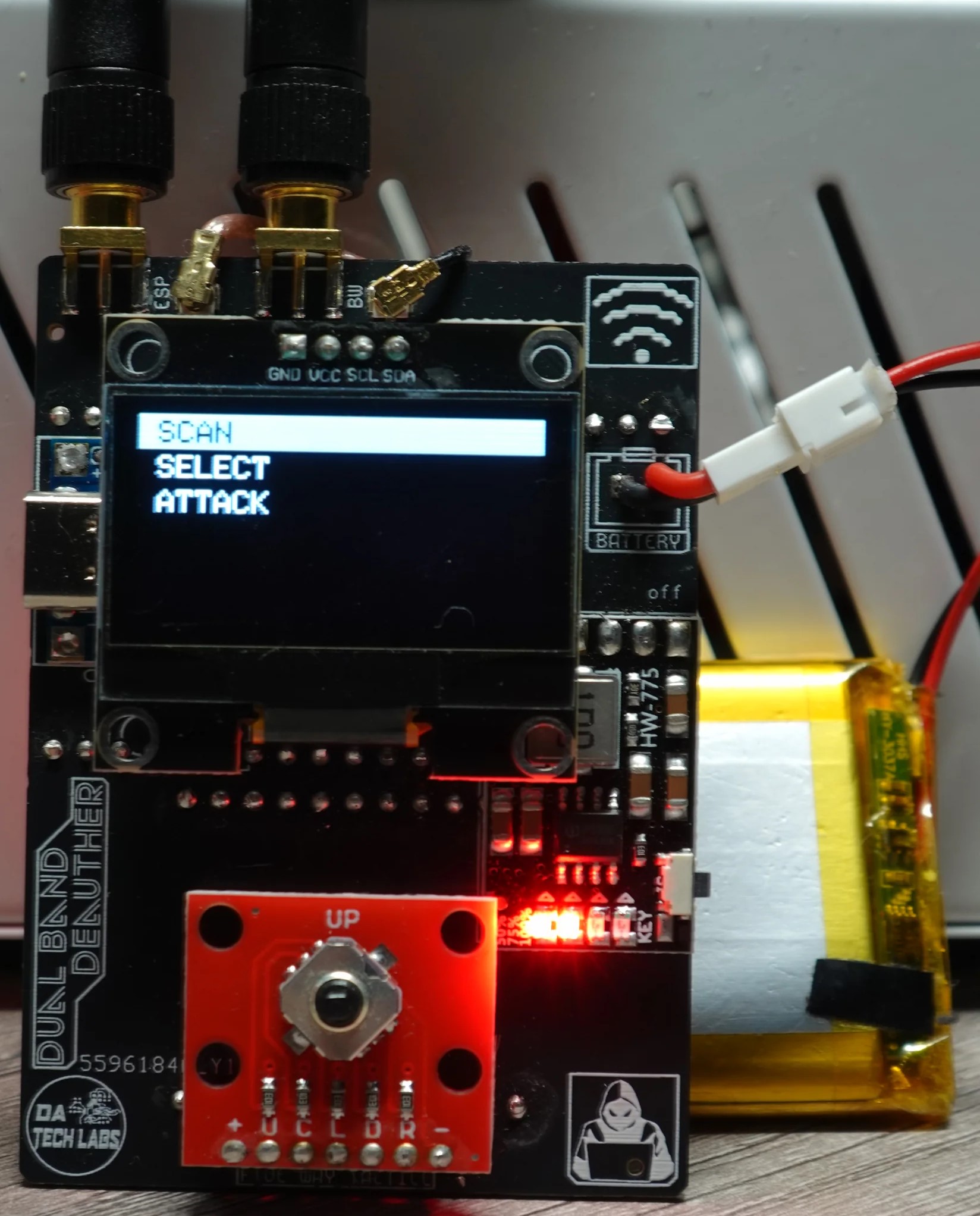 The WiFiX-DualBand-Deauther comes with an intuitive menu system that provides easy navigation through its core functions.