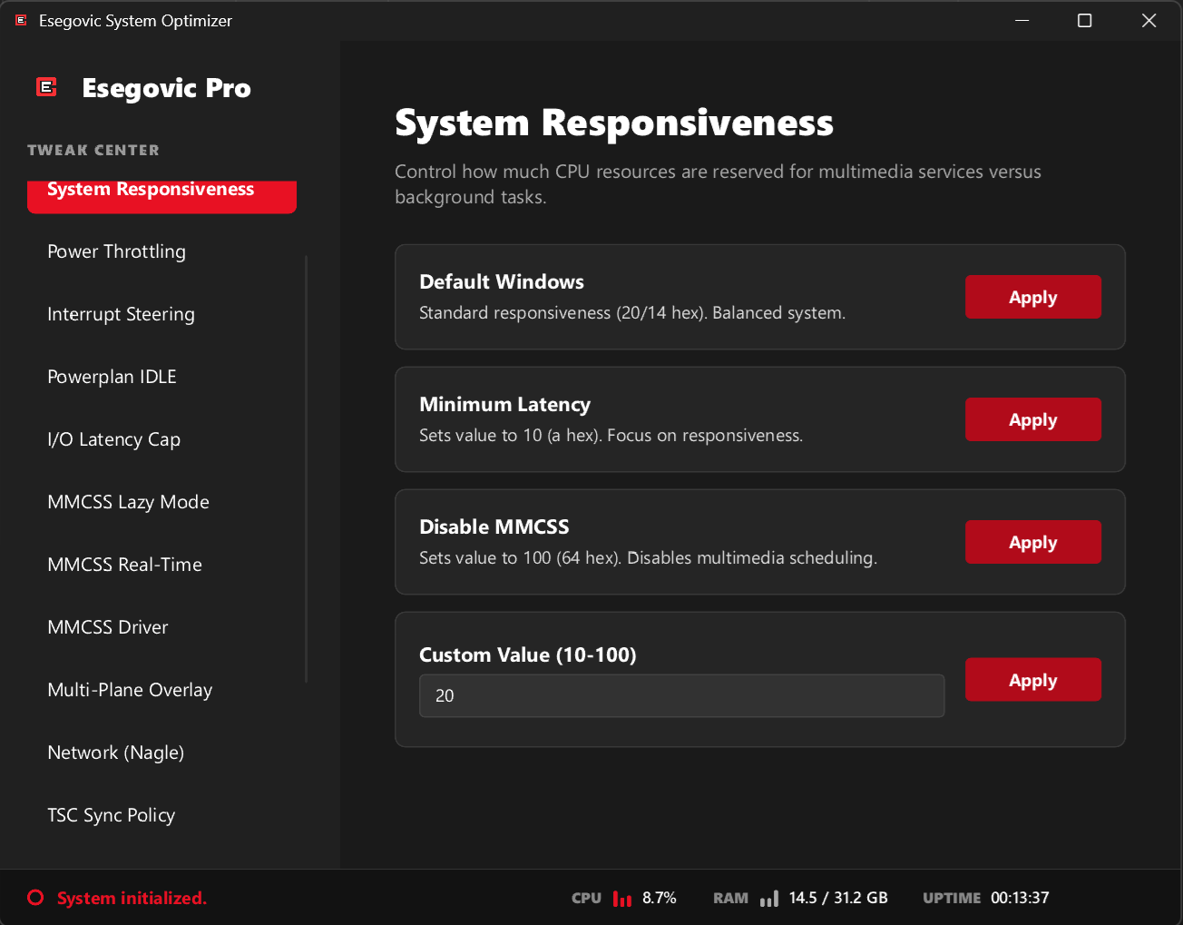 - π MMCSS Optimization: Advanced Multimedia Class Scheduler Service tweaks (Lazy Mode, Real-Time, Driver) to prevent background CPU spikes.