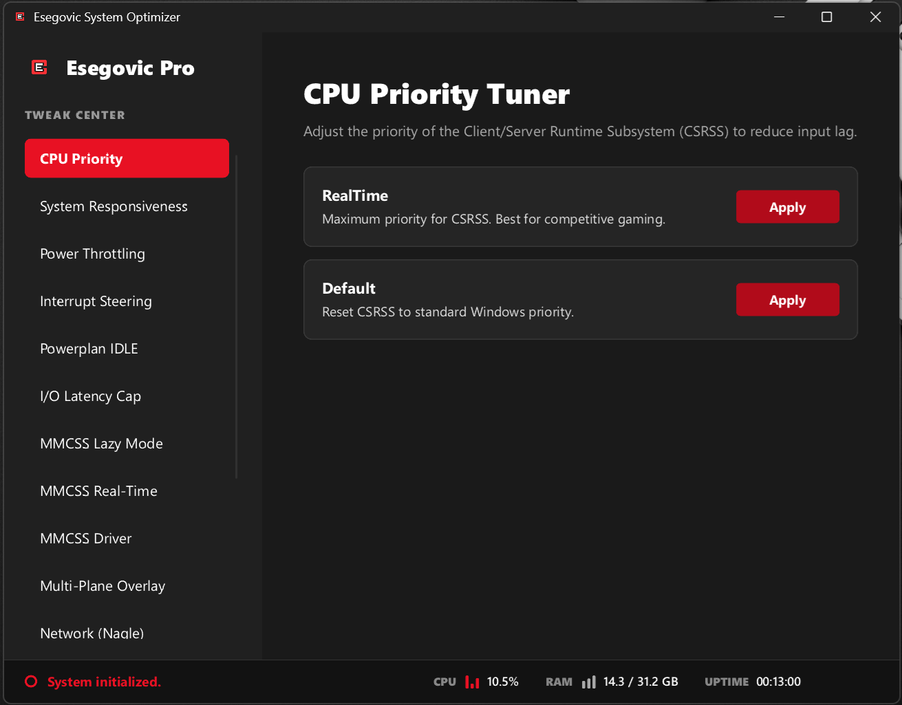 - ποΈ CPU Priority Tuner: Adjust CSRSS (Client/Server Runtime Subsystem) priority to "RealTime" for instantaneous input response.