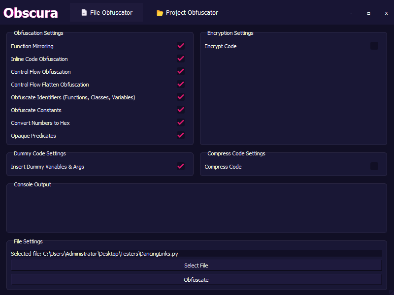 Obscura is a Python code obfuscation tool designed to protect your source code from reverse engineering and tampering. This is a learning project for me, and while it includes a variety of obfuscation techniques, please note that it may not be as robust as other well-known public methods. Some features are theoretical and may not work as expected.