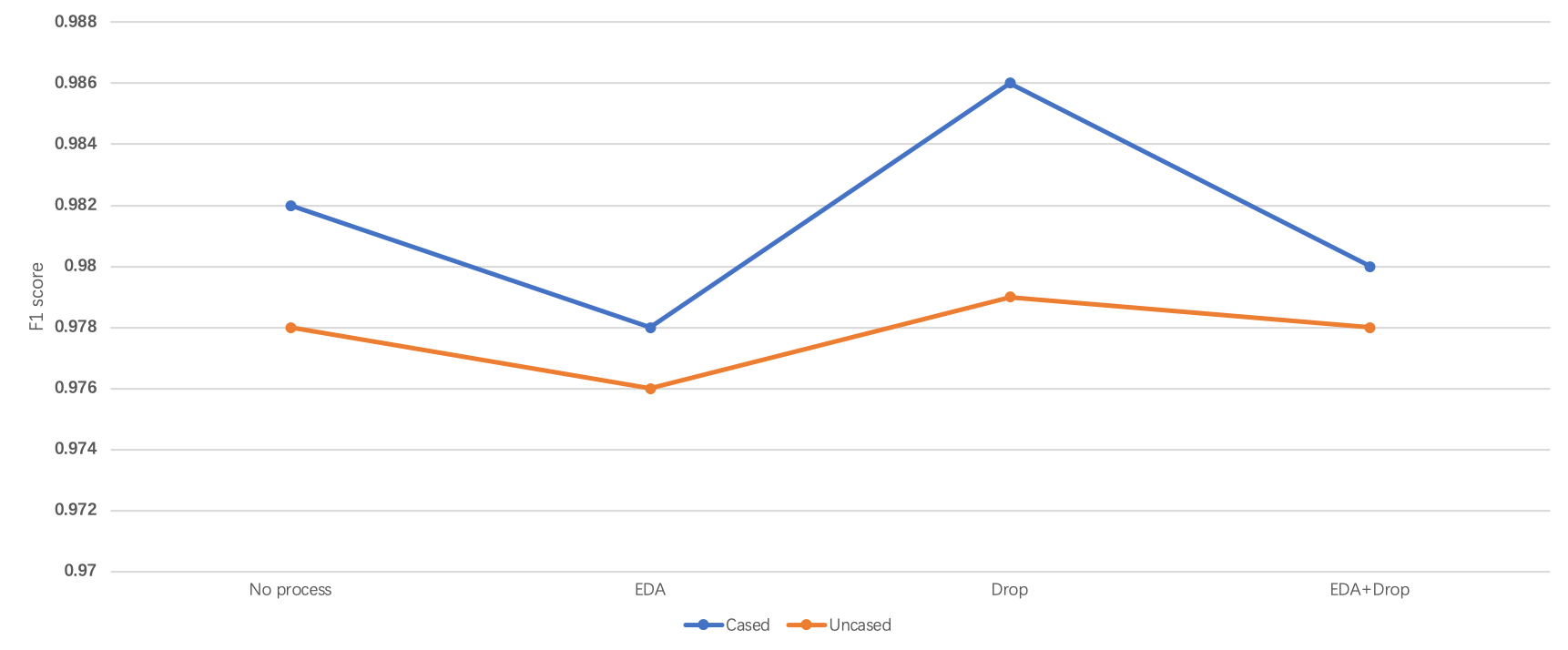 In the end, we combine different methods of data processing and u can see the f1 score from the chart. We get the best f1 score(0.986) from Cased text + drop sentence.