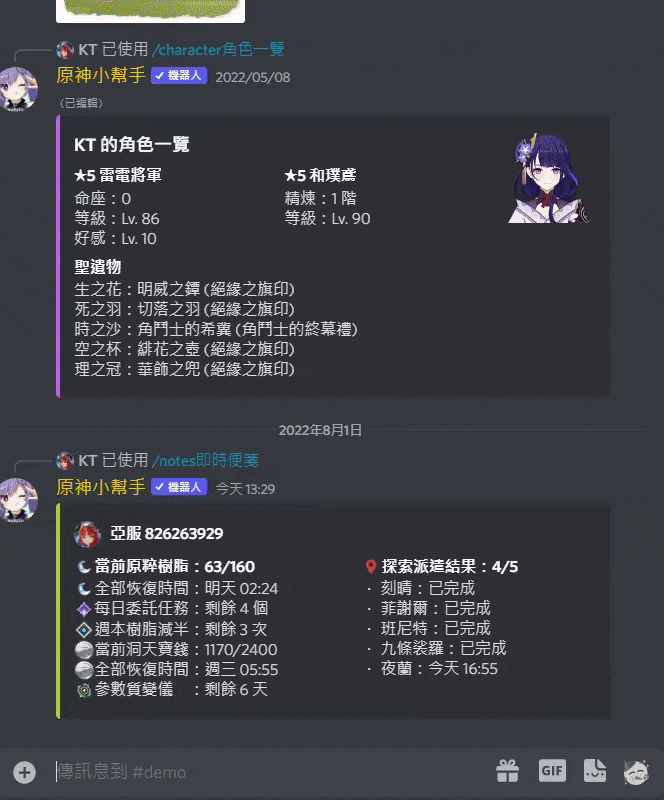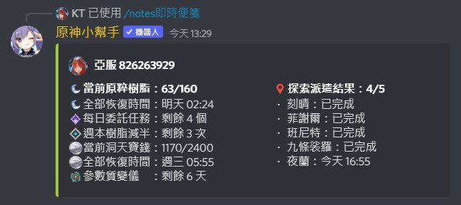 原神小幫手:一個多功能的 原神 & 星穹鐵道 Discord Bot 機器人,包含:即時便箋、Hoyolab 每日自動簽到、角色展示櫃、深境螺旋紀錄、旅行者札記...等等