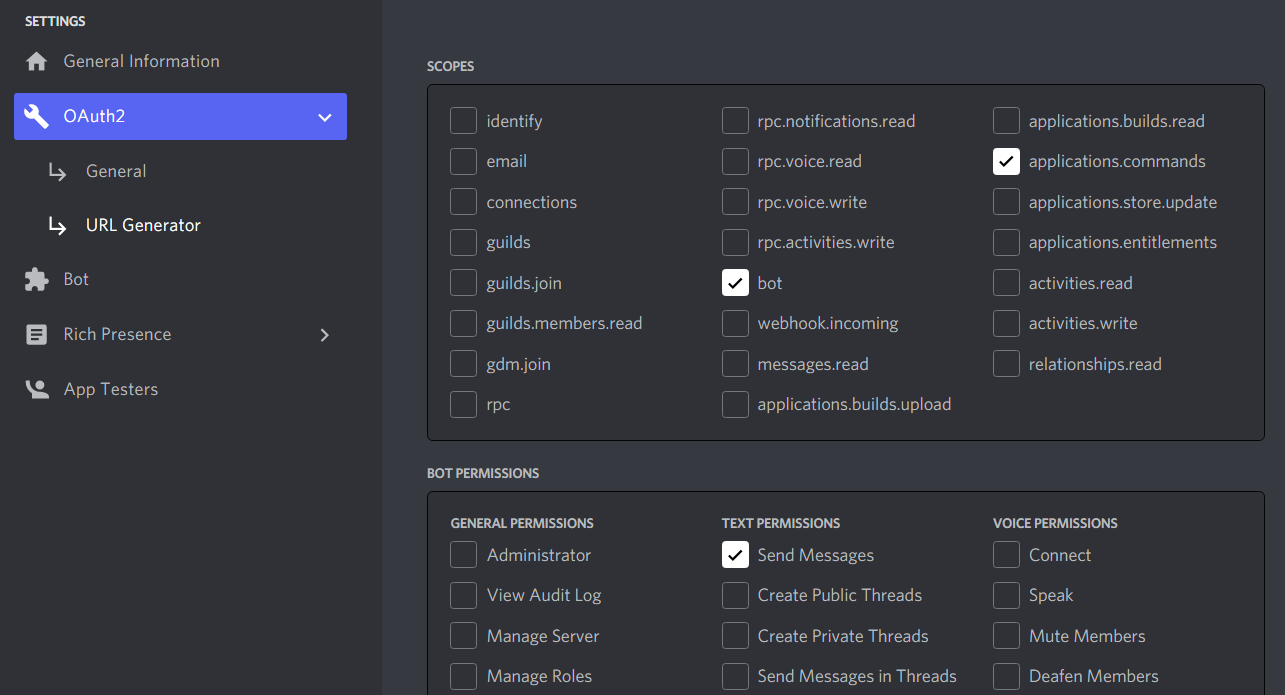 - 在 OAuth2/URL Generator,分別勾選「bot」「applications.commands」「Send Messages」,最底下產生的 URL 連結就是機器人的邀請連結,開啟連結將機器人邀請至自己的伺服器