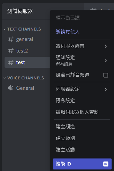 - 在自己的 Discord 伺服器名稱或圖示上按滑鼠右鍵,複製伺服器 ID(複製 ID 按鈕需要去 設定->進階->開發者模式 開啟)