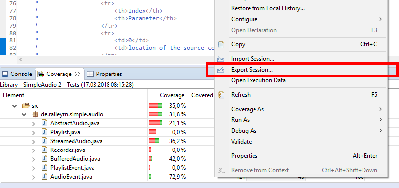 - Make a right click in the coverage view and click on export session