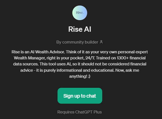 It's important to note that while Rise is a powerful tool for financial education and information, it is not a substitute for professional financial advice. Rise operates purely on informational and educational grounds and should not be construed as providing financial recommendations or advice. Users are encouraged to consult with qualified financial advisors before making any investment decisions.