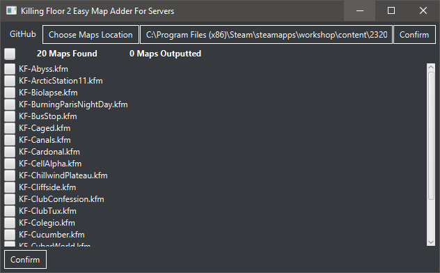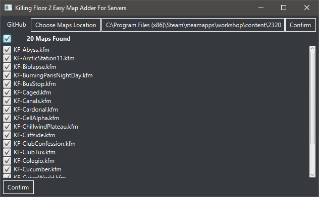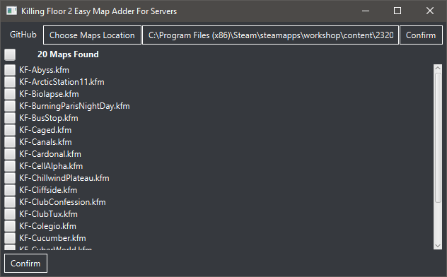 - Select the directory where the workshop maps are saved to (Typically found in C:\Program Files (x86)\Steam\steamapps\workshop\content\232090 or \Documents\My Games\KillingFloor2\KFGame\Cache)