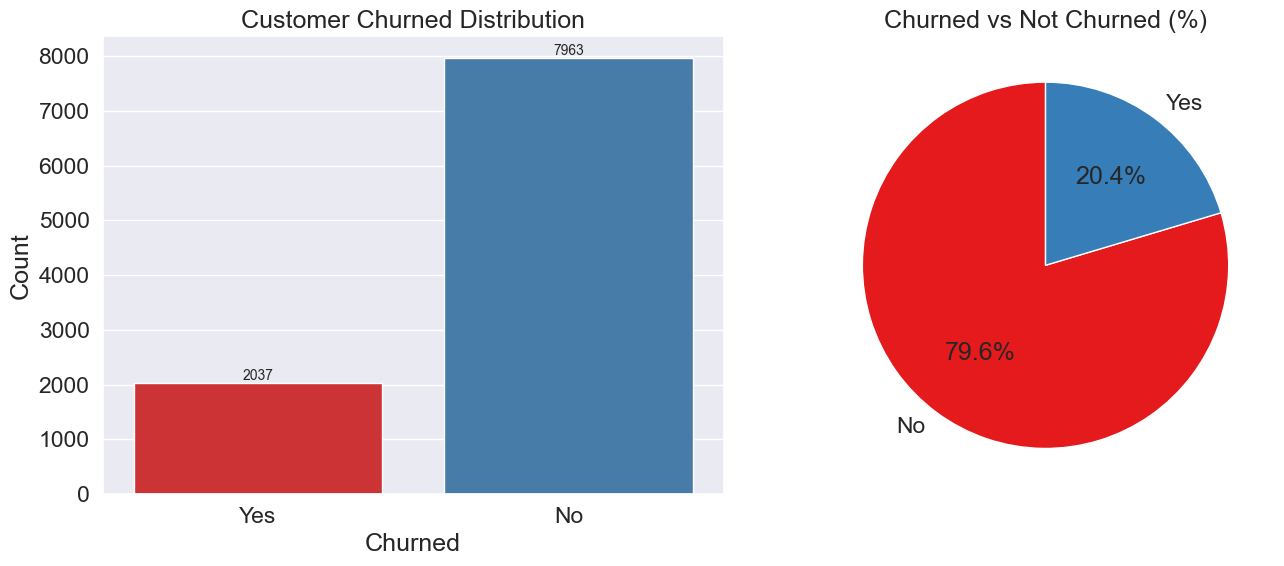 79.6% customers retained vs 20.4% churned — SMOTE applied to balance dataset.