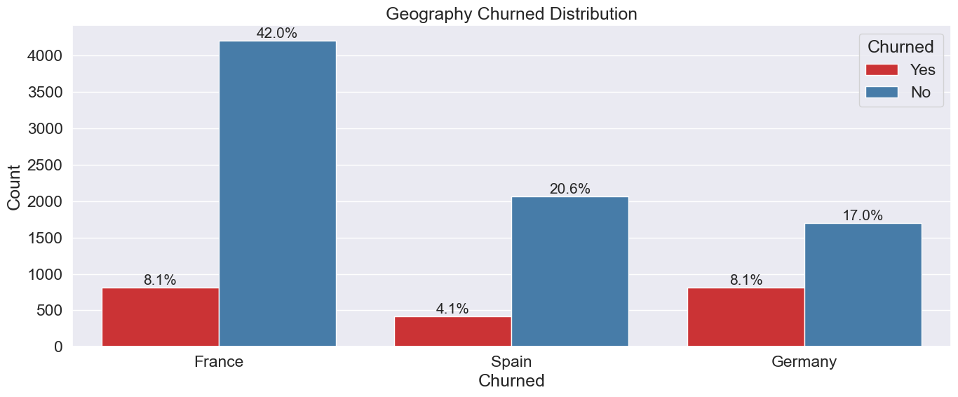 Germany shows 2× higher churn rate; two-product customers are most loyal.