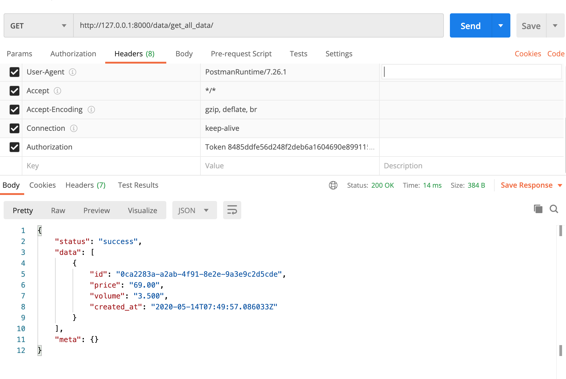 I am trying to apply TokenAuthentication on My an api http://127.0.0.1:8000/data/get_all_data/. The process is given here step by step: