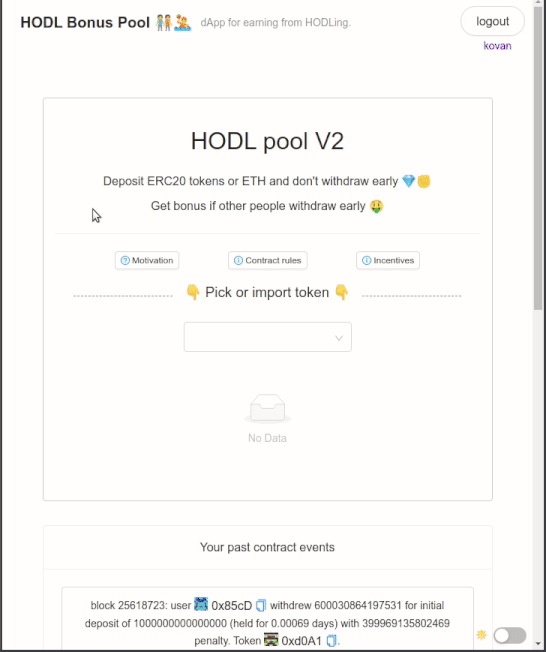 Ethereum dApp for a HODLing pool with bonuses and penalties.