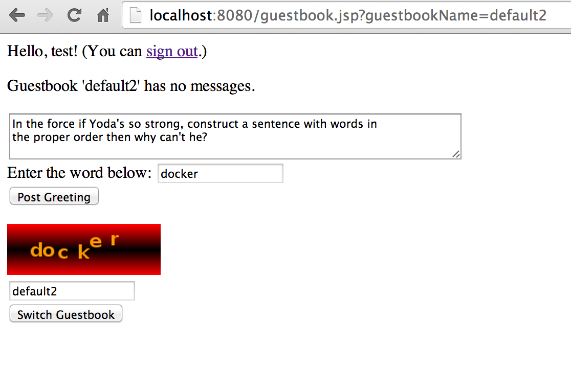 you can visit the URL that the development server is running on (likely: http://localhost:8080). You should see a figure that looks like the following. The application is the (probably all-too-familiar) guestbook app, but with a 'captcha' image and field added. You must type in the captcha word correctly for the entry to be posted.