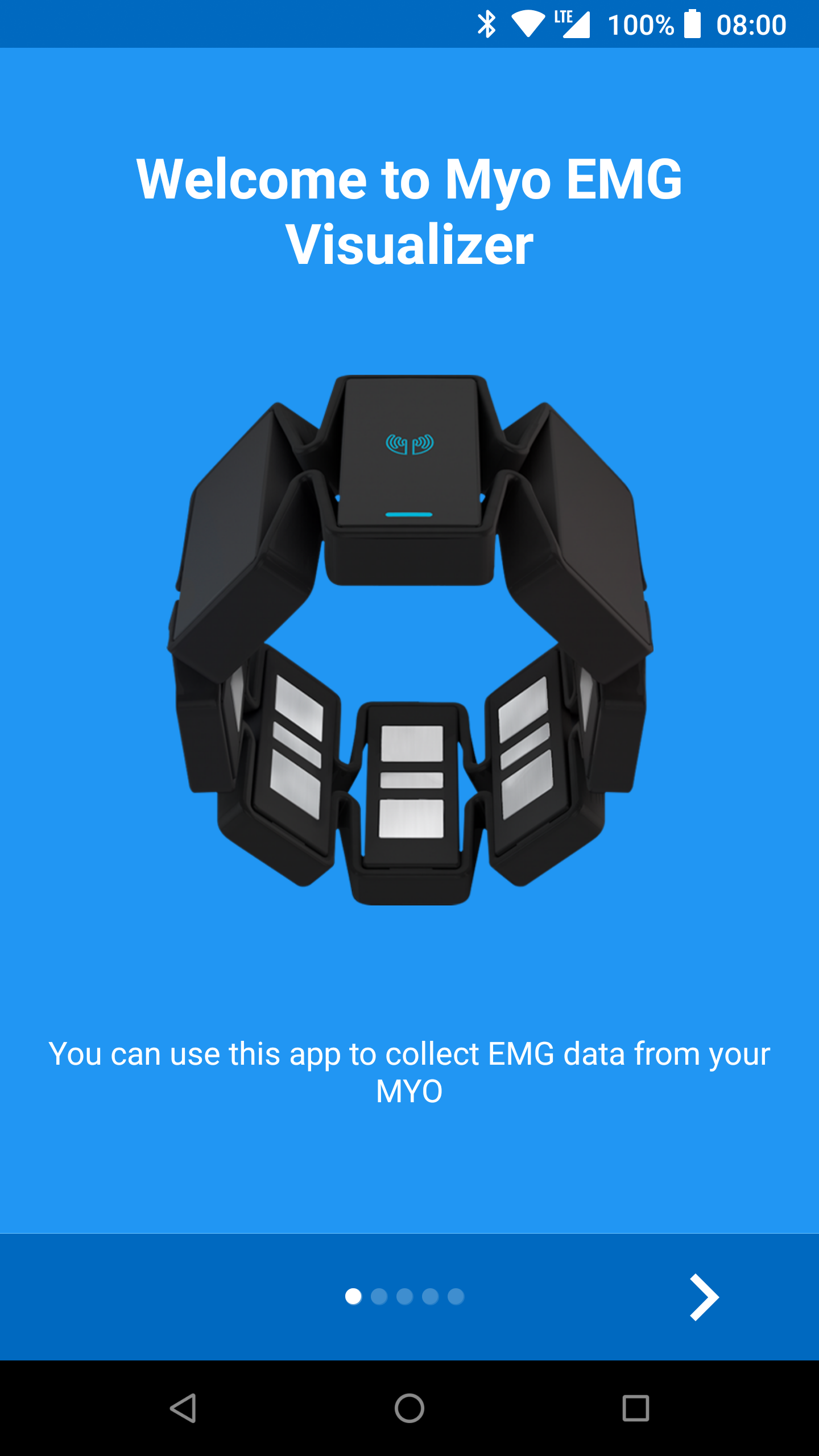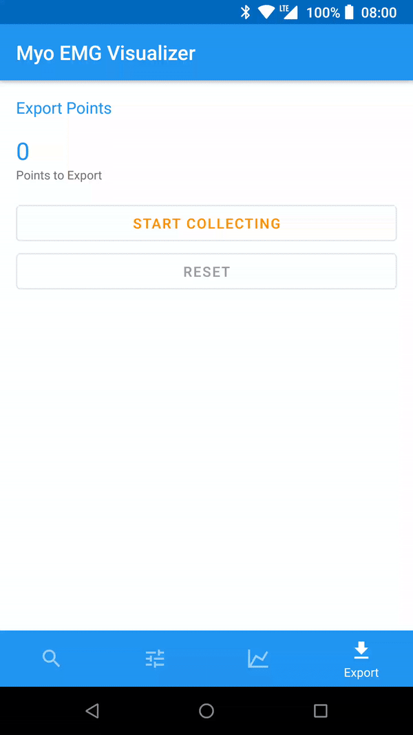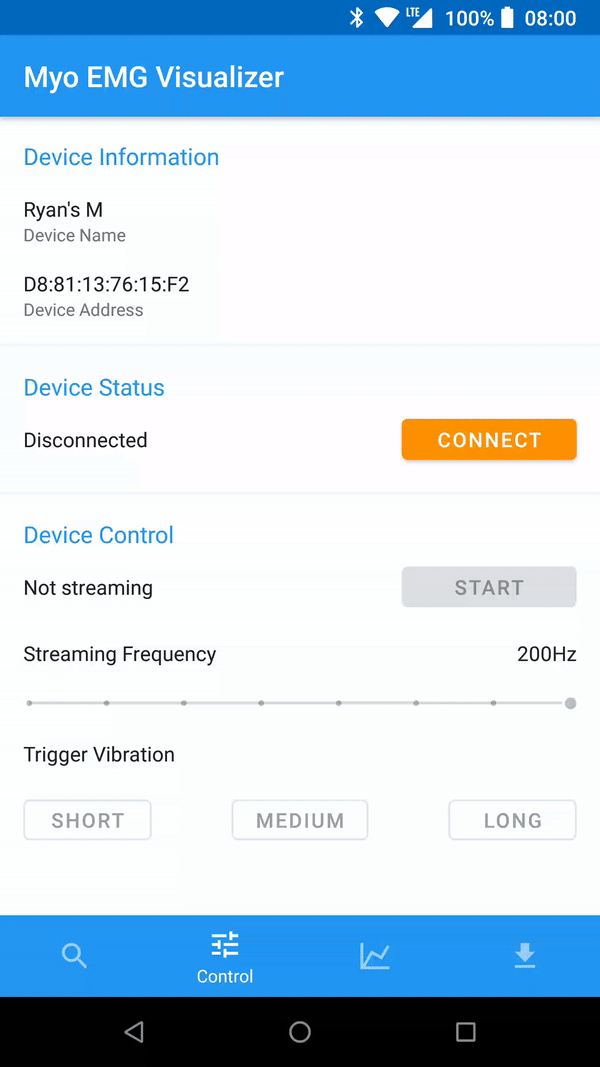 This repo contains also a sample app that showcases the usage of the library: Myo EMG Visualizer. With this app you can stream EMG Raw data from your device and save it as a CSV. The app is also available on the play store: