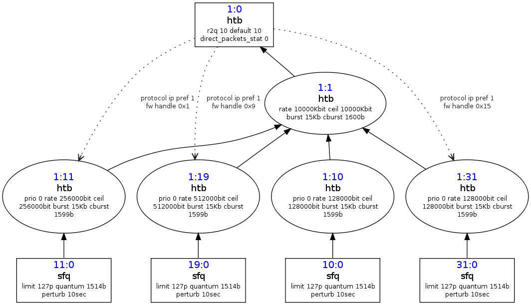 class htb 1:10 parent 1:1 leaf 10: prio 0 rate 128000bit ceil 128000bit burst 15Kb cburst 1599b