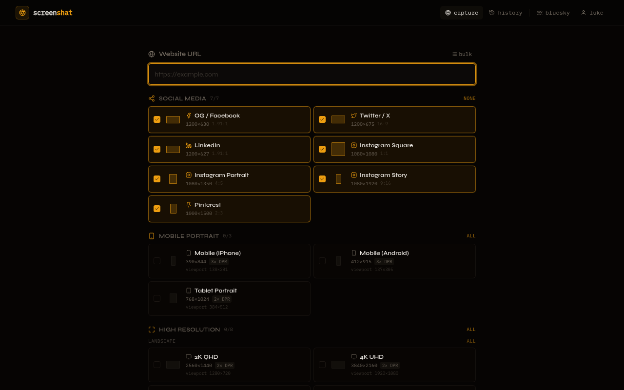 - Capture 19 presets in one shot — social cards (OG/Facebook 1200×630, Twitter/X 1200×675, LinkedIn 1200×627, Instagram square/portrait/story, Pinterest 1000×1500), mobile viewports (iPhone 14/15 390×844, Pixel 7 412×915, iPad portrait 768×1024), and high-res landscape + portrait (2K through 16K at correct device pixel ratios)