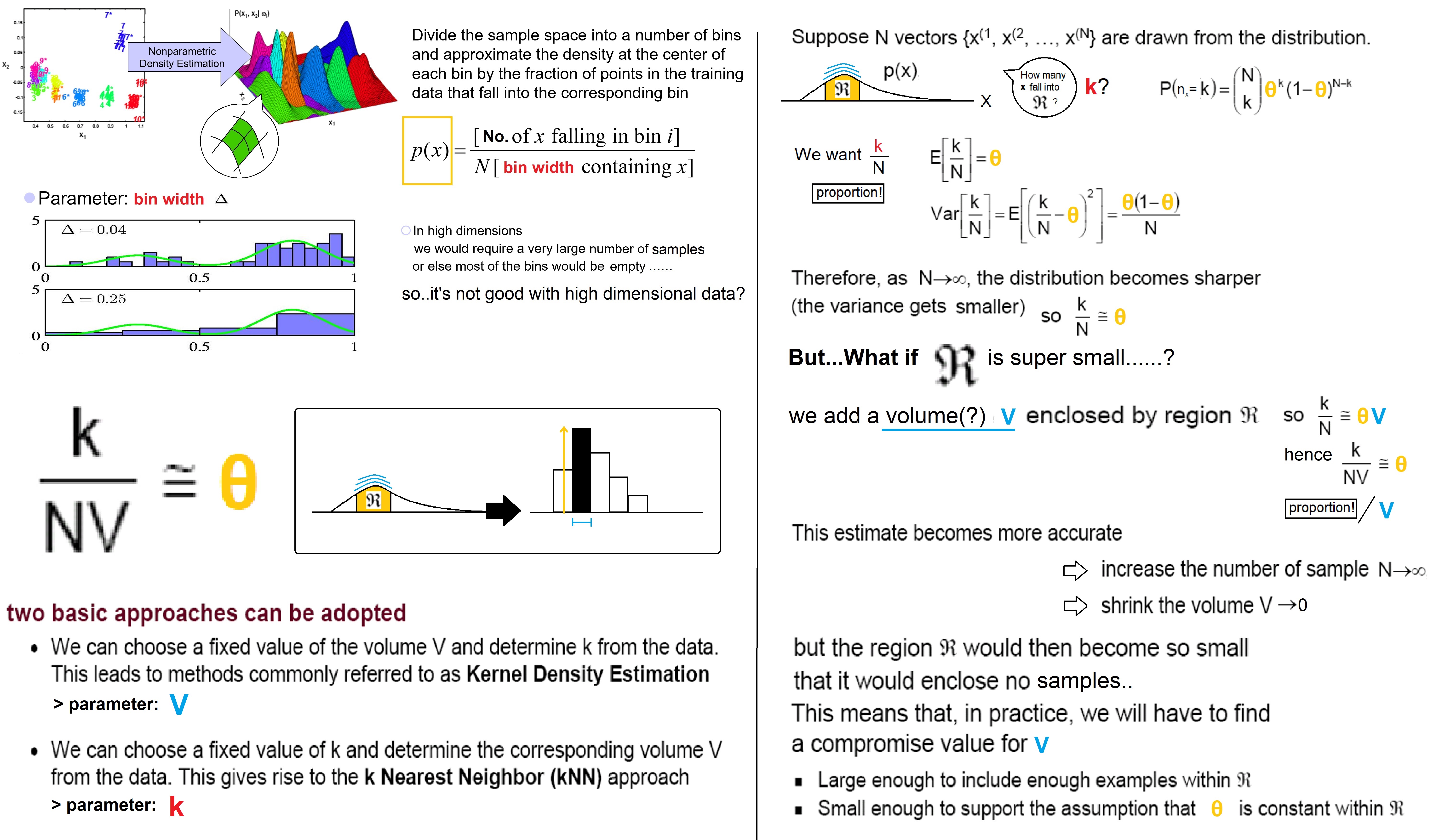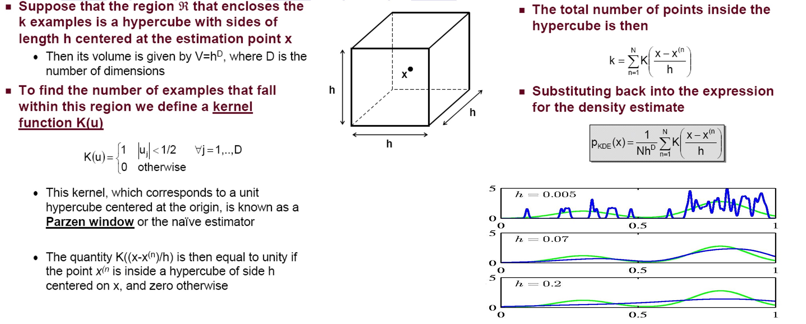Let's say..when you have a vector X, using a bin (in histogram), you can develop an empirical pdf f(X) without help from parametric assumptions about the underlying distribution. This empirical pdf f(X) uses a kernel function (classification function to accept/reject the data-pt by measuring a certain distance) that explains what's goin on inside the hypercube (bin). The sum of outputs of the kernel function returns total NO.of data-pt falling into the hypercube (bin) which is k.
