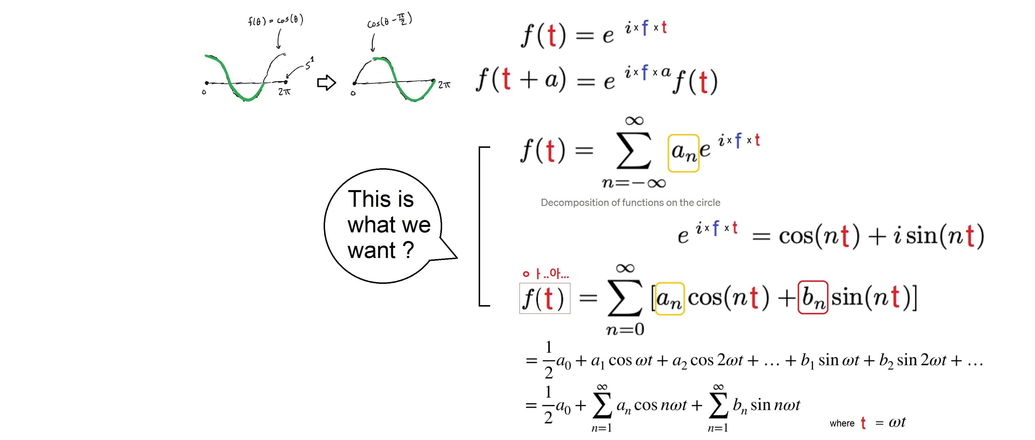 If rotating a function on a circle, we can graph a function on a circle by graphing it on a line segment (the left and right ends have to be connected). The functions are vectors: they can be added, multiplied by a constant. Rotation is Multiplication. Look at what happens when we rotate it by an angle a. The rotation is the same as shifting the argument to the function by a. The thing is... the functions in our buckets have to satisfy the property that rotating them (adding a in the bucket) is the same as multiplying them. And the functions below, where f is any integer, are exactly the functions that do satisfy this property where the coefficients a just tell us how much of each function to take (how much rotate?). This decomposition is called the Fourier Series. Therefore, we can write any function on the circle as a sum of such functions: