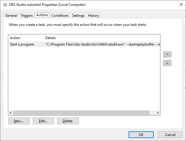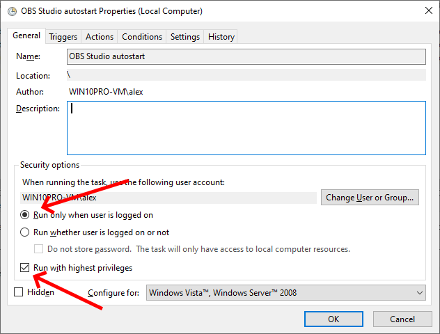 Notice that "OBS Studio autostart" is the name of the scheduled task you gave on the first property page of the task.