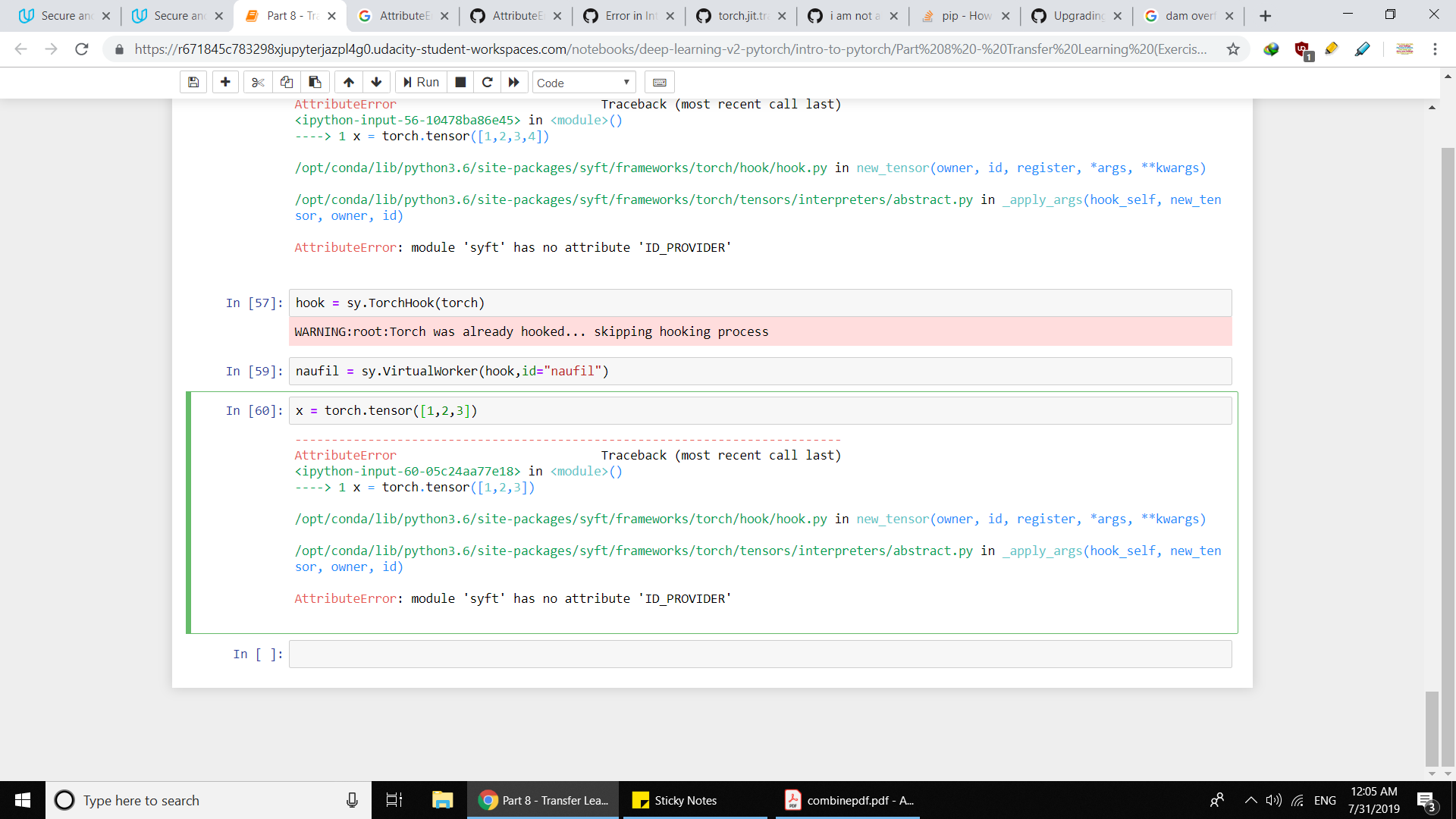 Trying to work on a little task given at the end of the video 4 of lesson federated learning where we are required to make 2 virtual workers and play with it but this error keeps popping up. Reinstalled different versions of torch and syft to make thus error go away but nothing happens.