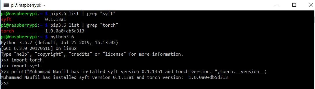 - Successfully Installed torch and pysft in Raspberry pi and laptop for a group project. It was a challenging task to install in raspberry pi. The installation took 24 hours to complete, ignoring the fact that another 24 hours I had wasted by installing the above packages in the wrong python version.