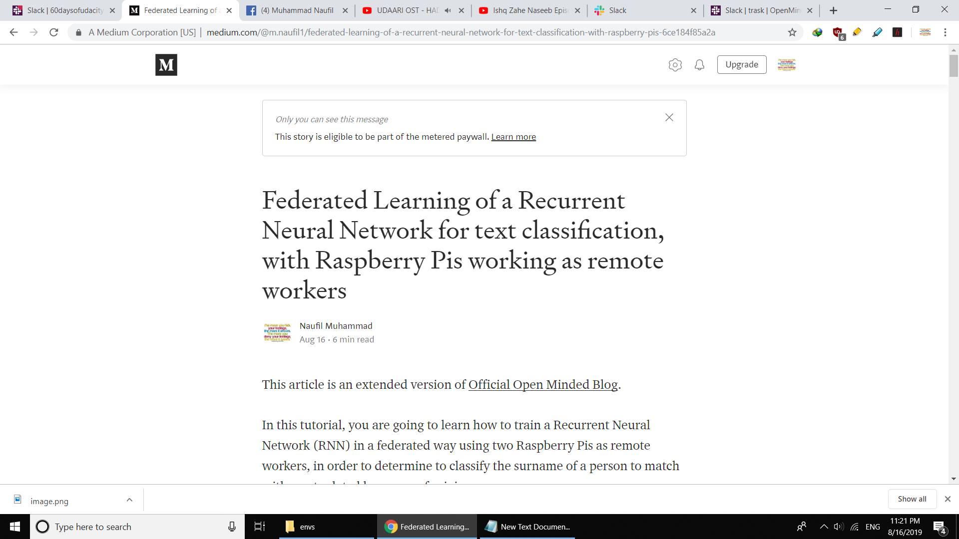 Published article on Medium about Federated Learning of a Recurrent Neural Network for text classification, with Raspberry Pis working as remote workers
