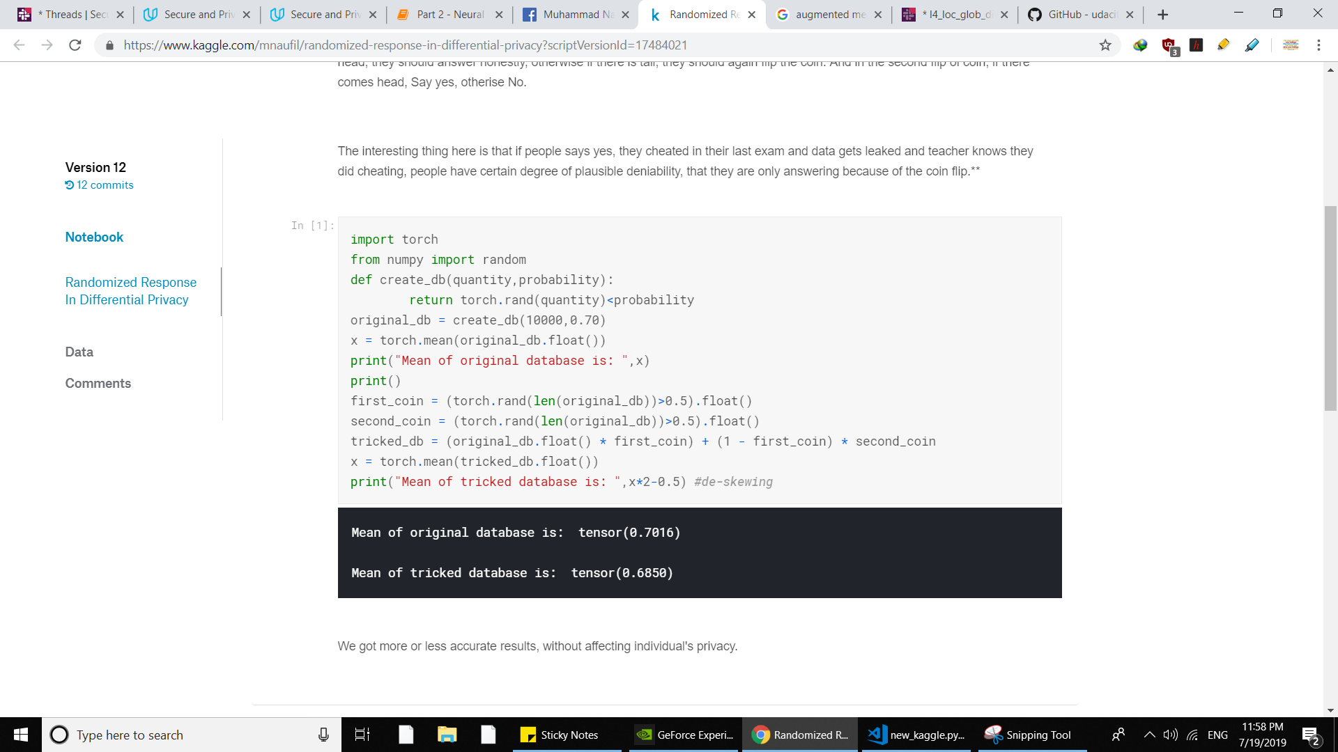 - Wrote my first ever kaggle kernel. This is about Randomized response in differential Privacy