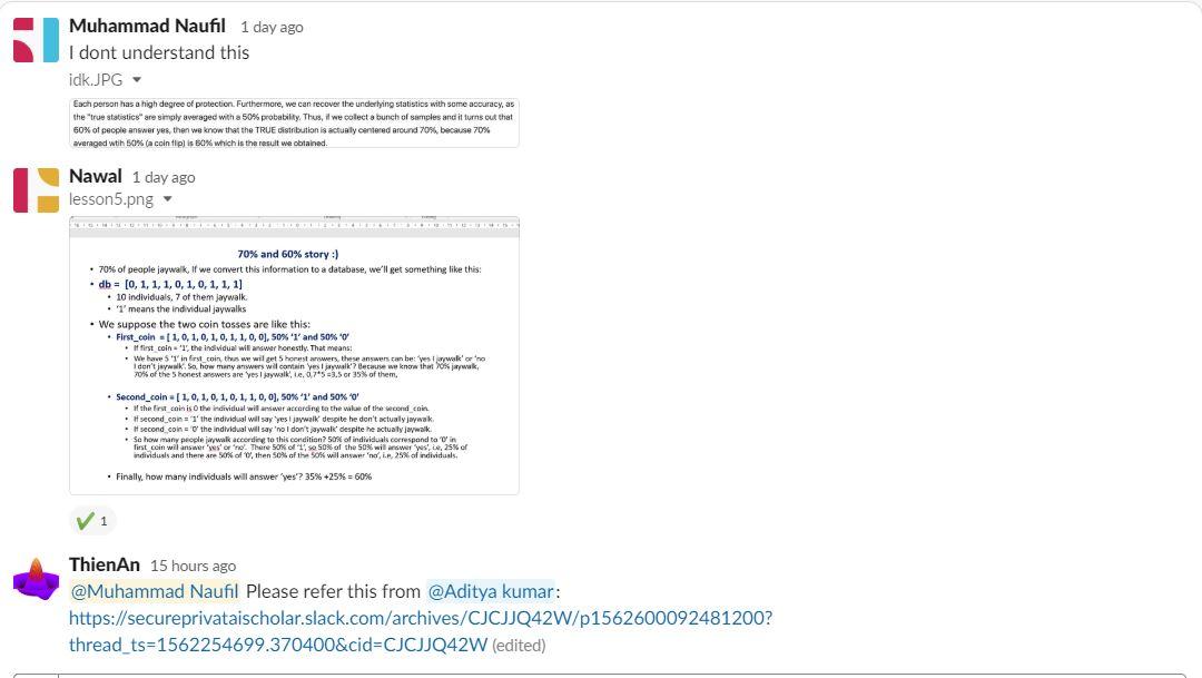 - Even though I had watched videos from 2 to 6 yesterday of local and global differential privacy lesson, I hadn't understood them fully. So today, I read people answers on slack about my confusions regarding these I posted yesterday and today on slack and practiced about the 60 70 % story in local and global differential privacy lesson.