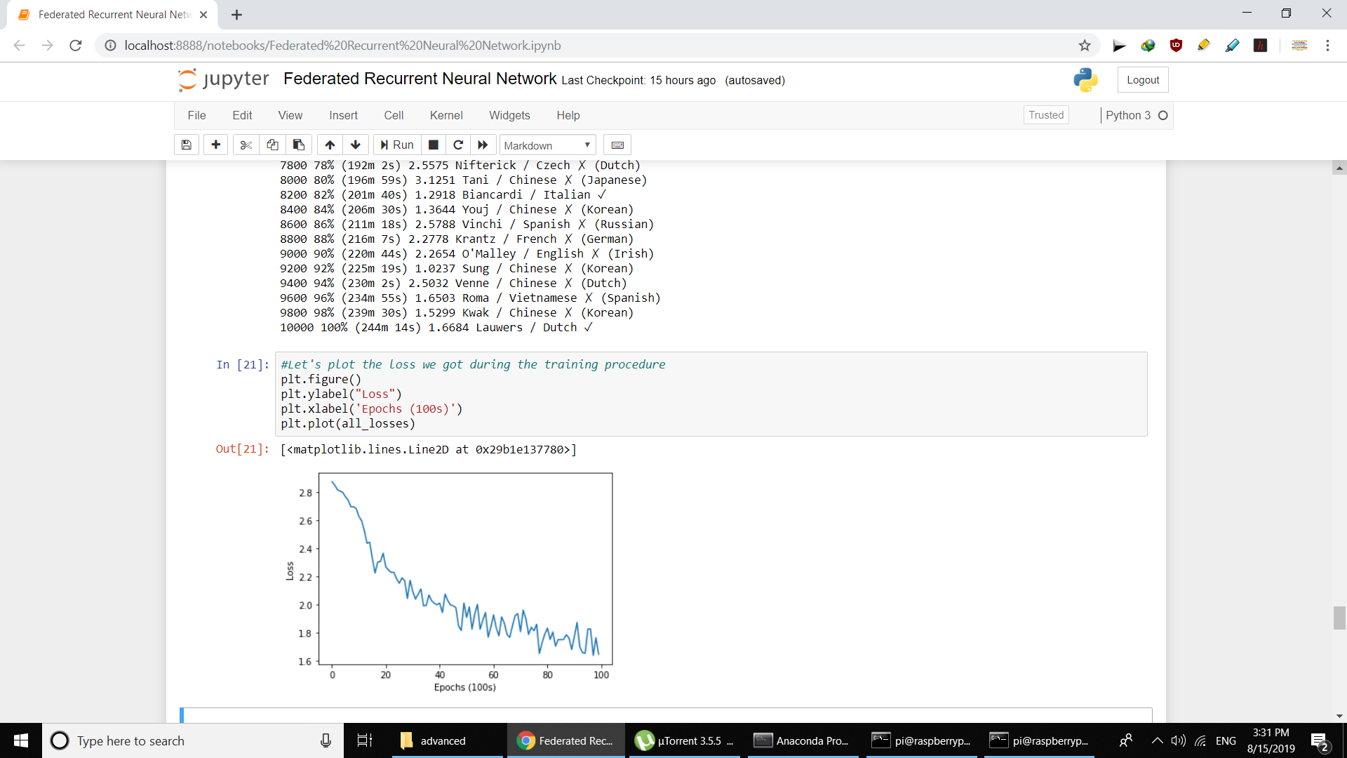 Learned how to train a Recurrent Neural Network (RNN) in a federated way with the purpose of classifying a person's surname to its most likely language of origin.