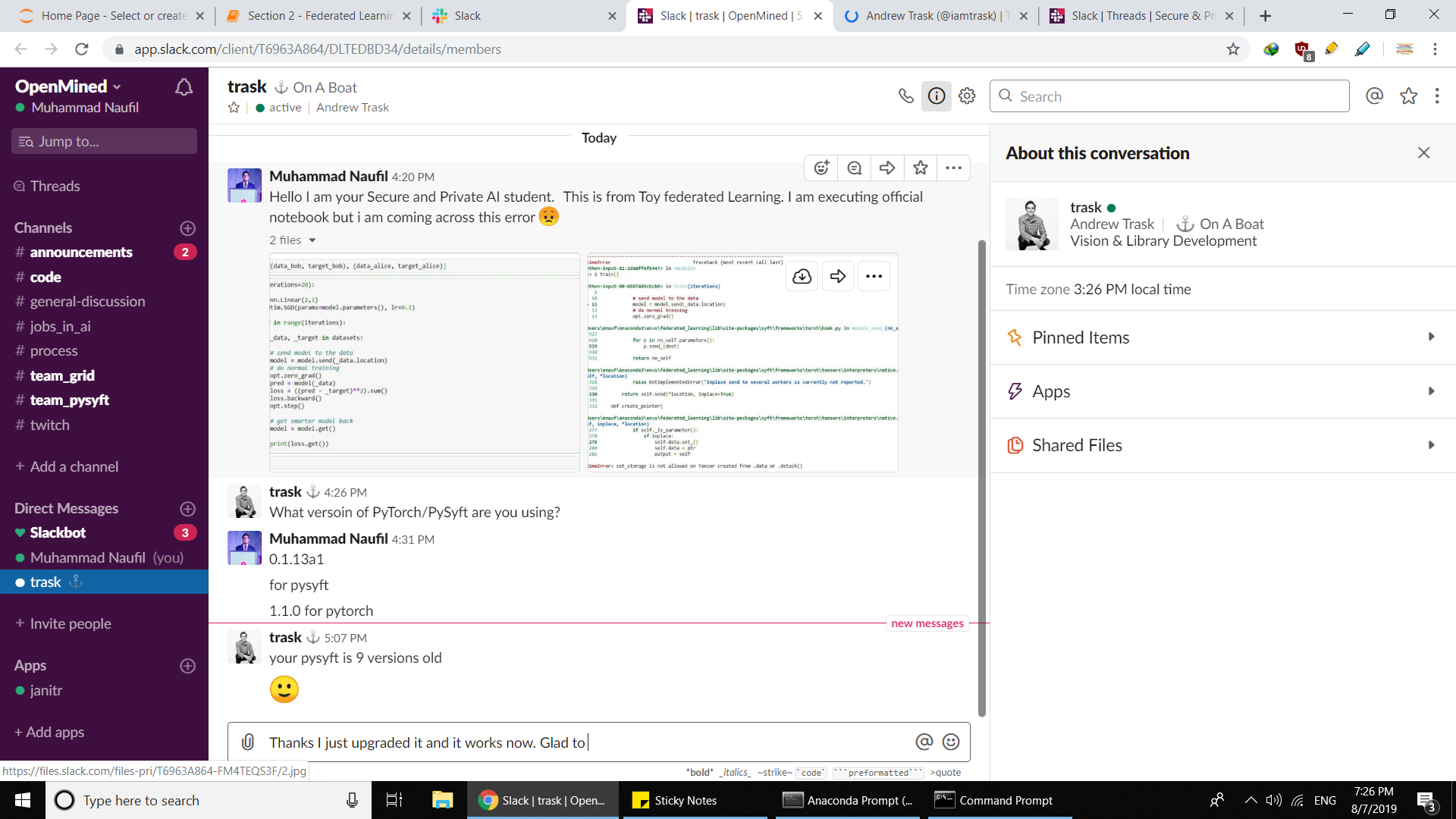 - Celebrated sir Andrew commiting to sharing my medium blog I wrote for #sg_pytorch-robotics group project at twitter @openminedorg.