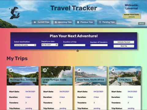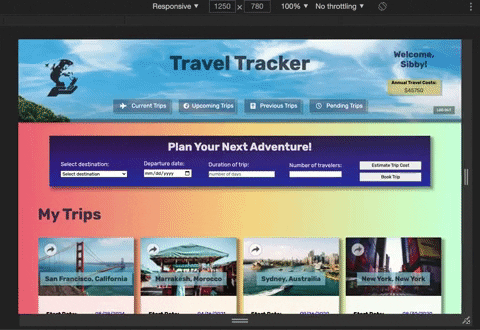 travel2020- and click the login button. - You'll then be taken to the home page and greeted by the name of the user you've selected, with that user's travel data displayed.