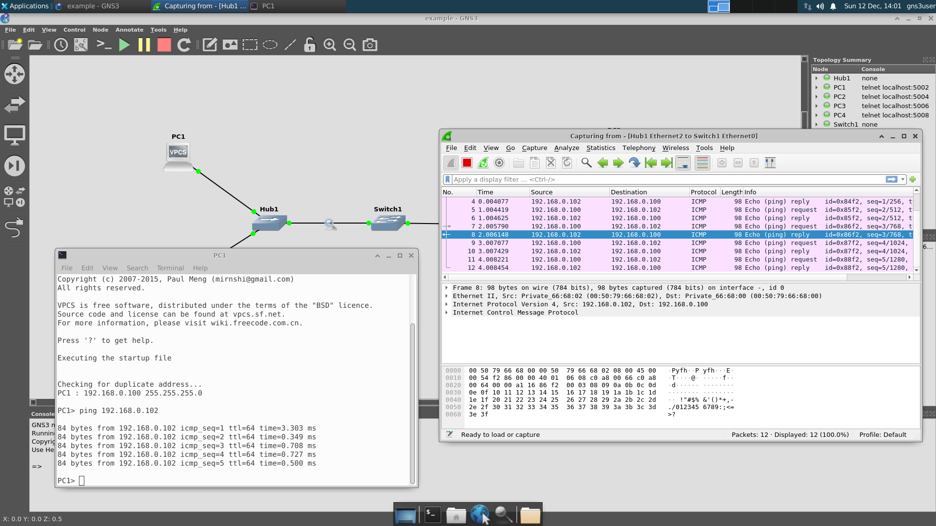 Right click on the wire going from Hub1 to Switch1, select Start capture and Wireshark will start up. Open PC1's terminal and type in ping 192.168.0.102. This will send 6 ping packets (and 6 pong packets) between PC1 and PC3 and you will be able to see them in the Wireshark capture.