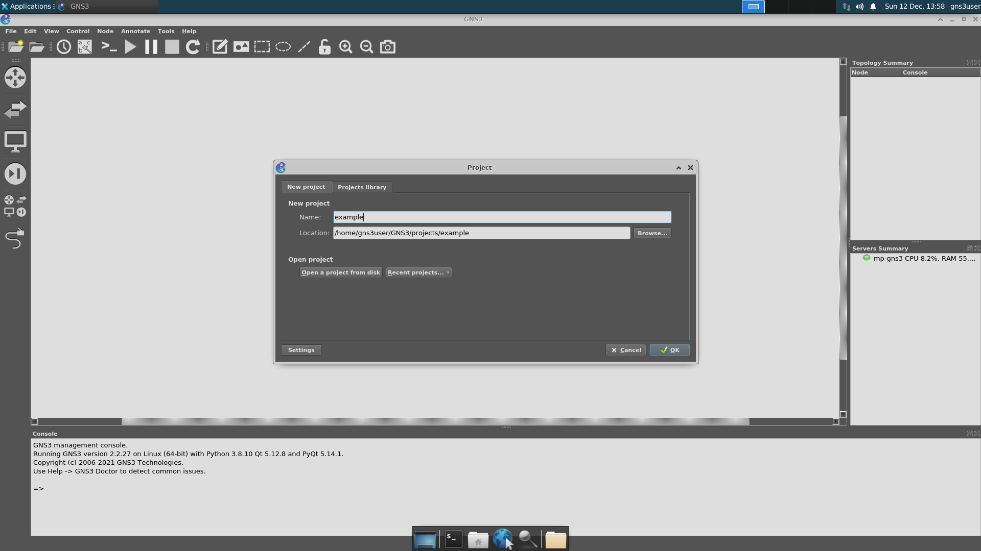 GNS3 is preconfigured in the VM so you do not have to fiddle with the configuration files. Let's create an example project.