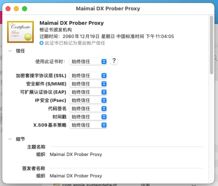 在 Mac OS 系统上,请将钥匙串加入"系统"中,并双击打开证书详情,在信任子菜单下调整设置,如下所示:
