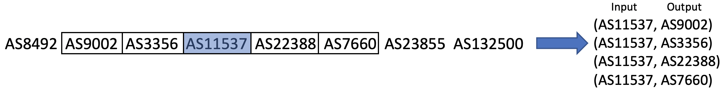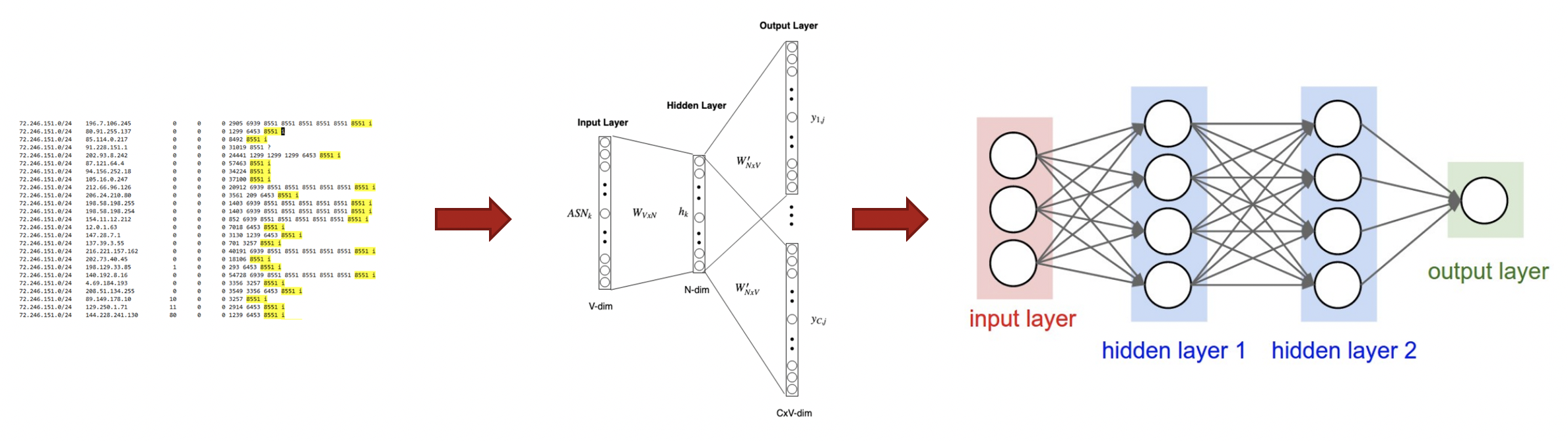 Our method works as follows: first, using a shallow neural network, we map each AS number (ASN) to an embedded vector.