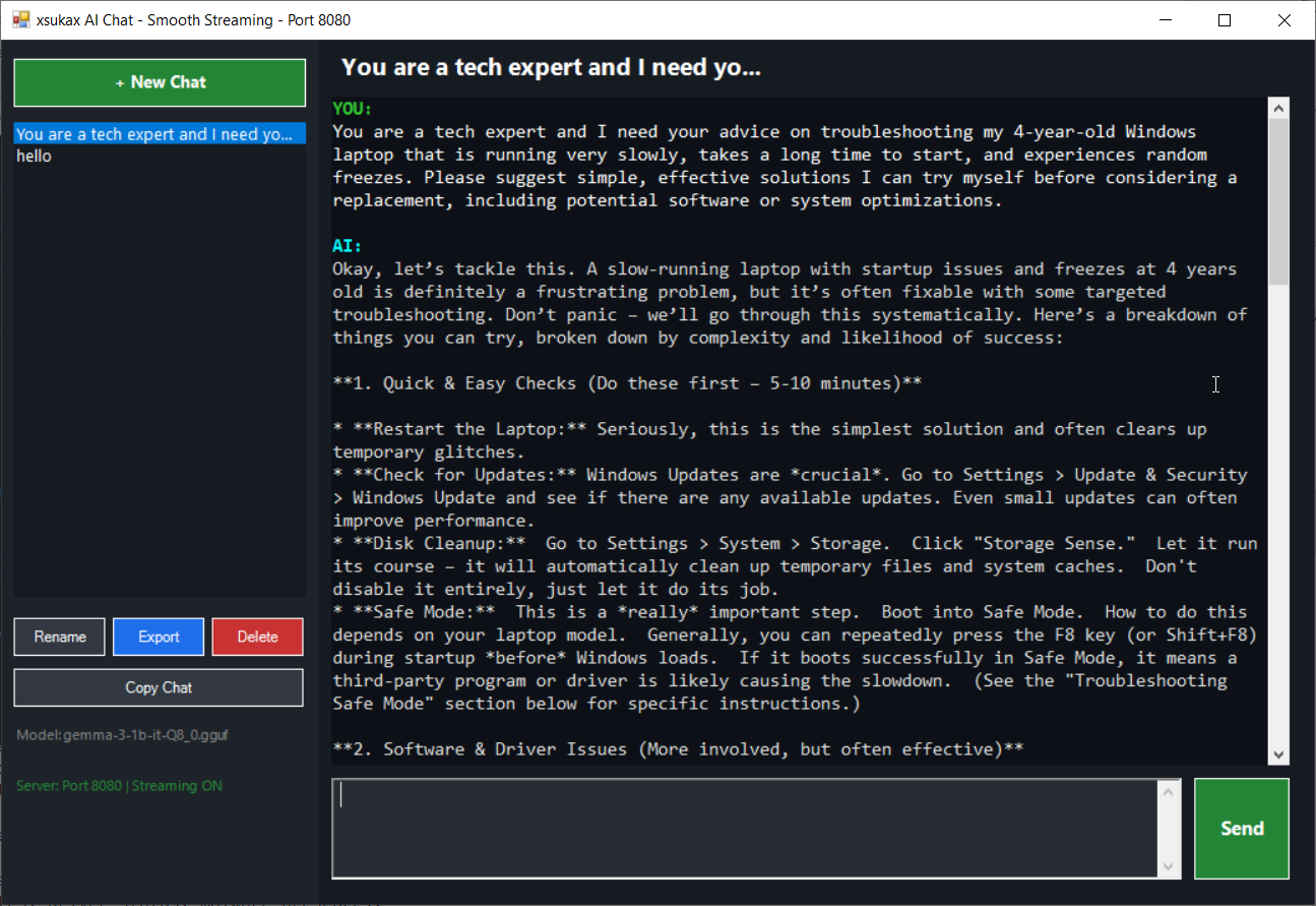 - GUI Chat Client: Windows Forms-based interface with smooth streaming text output